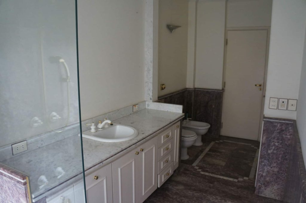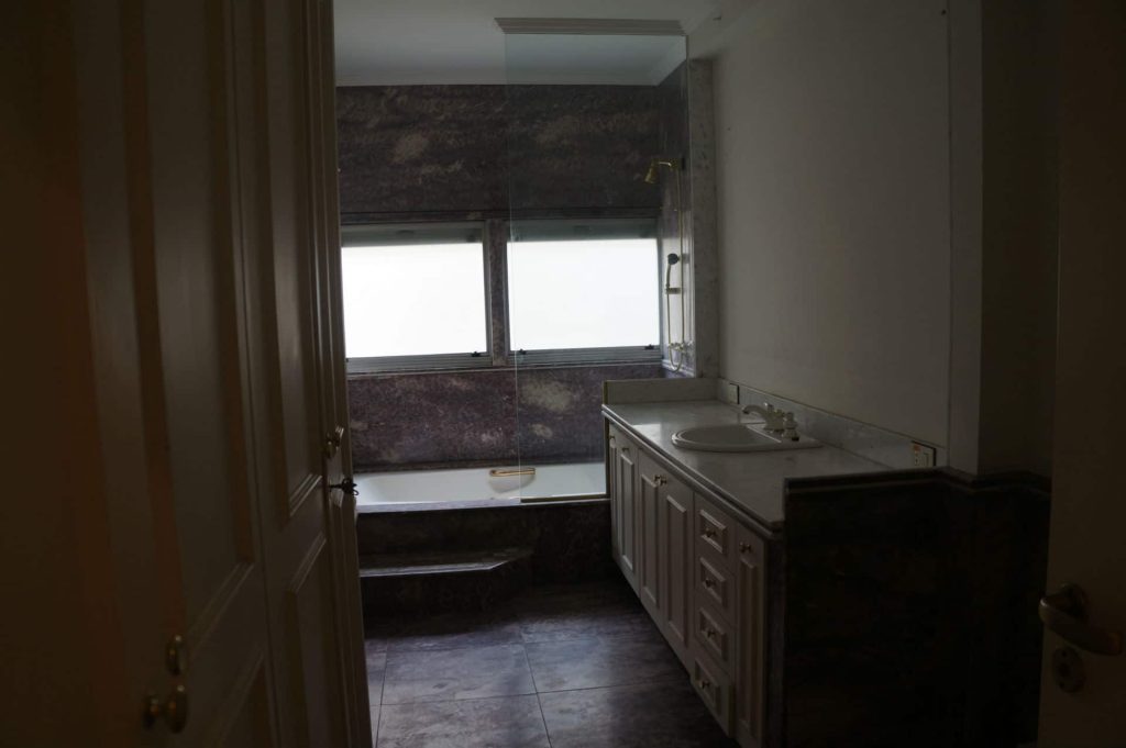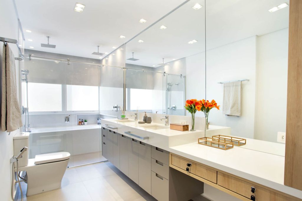 O ambiente ganhou vida nova e foi totalmente reformado para um banho spa, recebendo uma extensa bancada com duas cubas e uma linda penteadeira, facilitando o dia do casal. Foi instalada uma nova banheira com hidromassagem, dois chuveiros de teto, além de todos os metais e acessórios.
