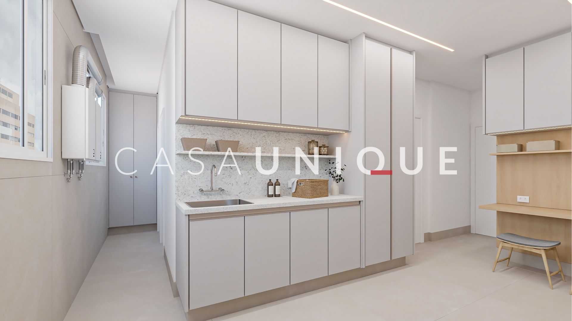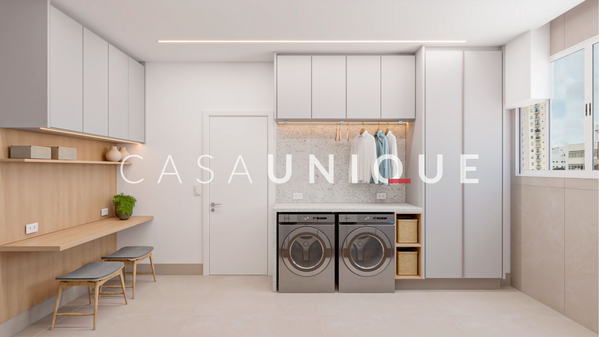 A área de serviço conta com armários planejados e espaço para duas máquinas, para garantir um dia a dia prático e organizado.