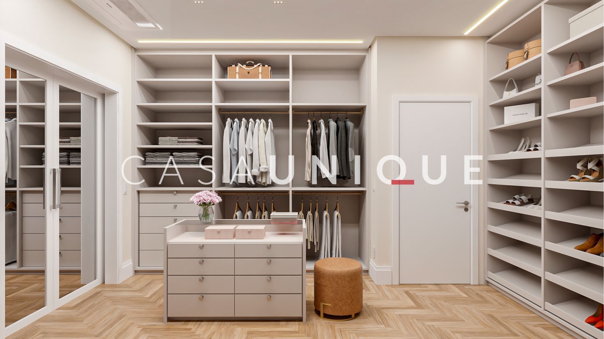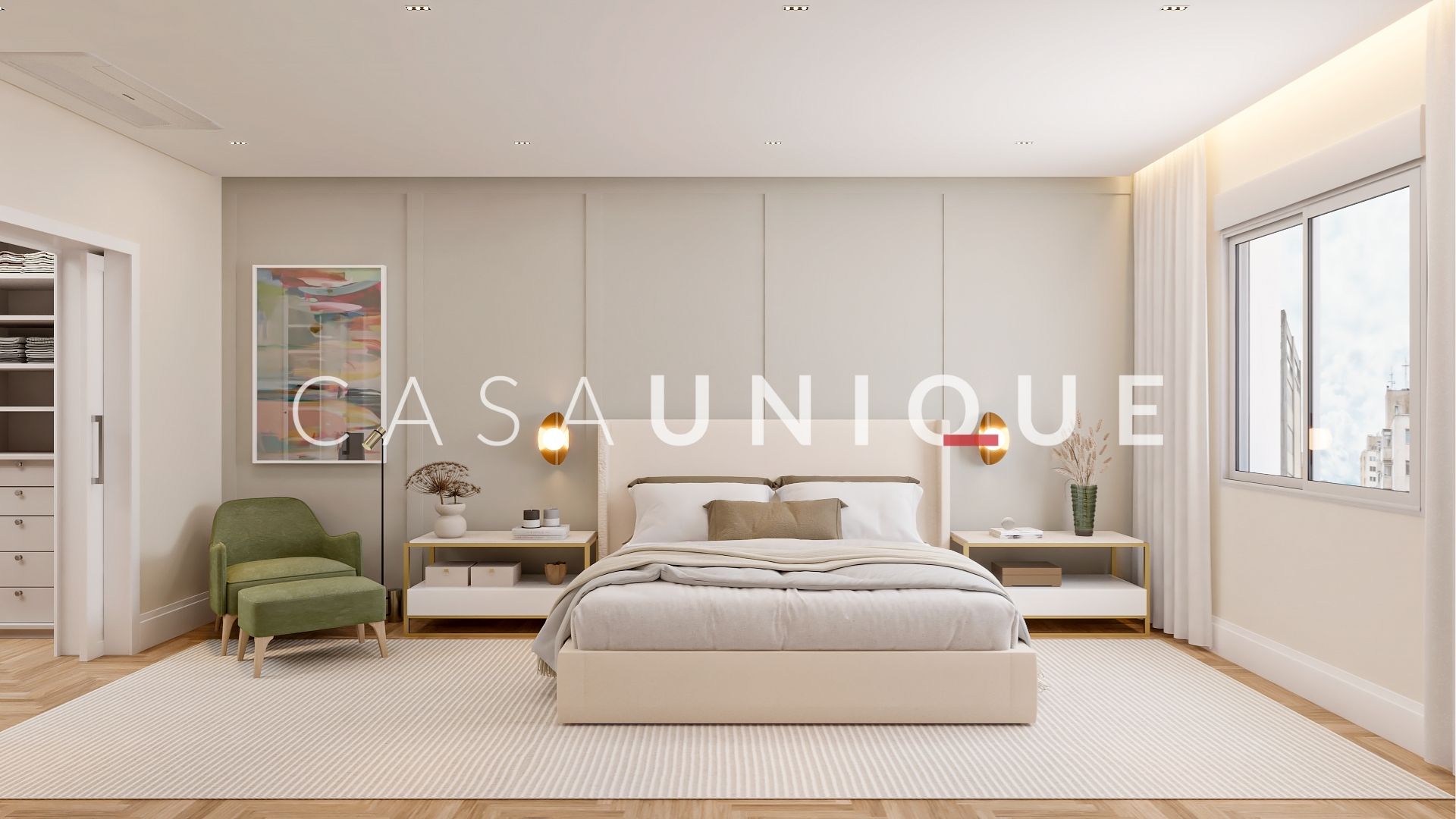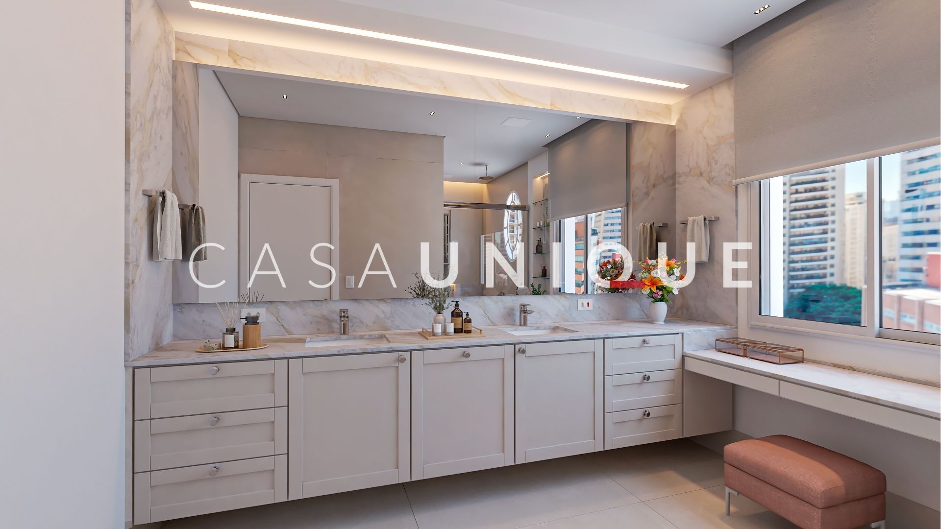 Na área íntima, são quatro suítes amplas e bem distribuídas, todas equipadas com persianas automatizadas em suas janelas. A suíte master é um verdadeiro retiro particular, perfeita para recarregar as energias. Além disso, contempla um walk-in closet com ilha e um banho spa maravilhoso com duas cubas, bancada em mármore branco paraná, dois chuveiros de teto, toalheiro térmico e uma banheira jacuzzi para relaxar após um longo dia.