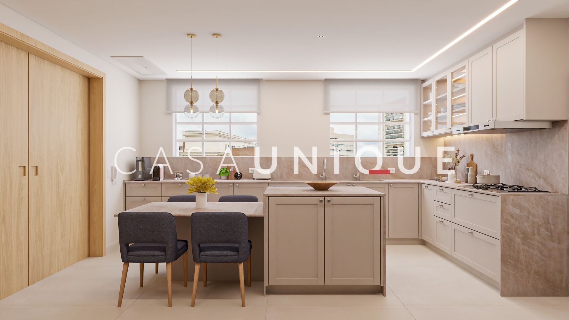 A cozinha gourmet com ilha e copa foi pensada para quem aprecia funcionalidade sem abrir mão da beleza – com bancadas em quartzito Taj Mahal. Além disso, ela também oferece integração com o living através de porta de correr, sempre que a família desejar, se tornando o cenário perfeito para momentos especiais e criando memórias inesquecíveis.
